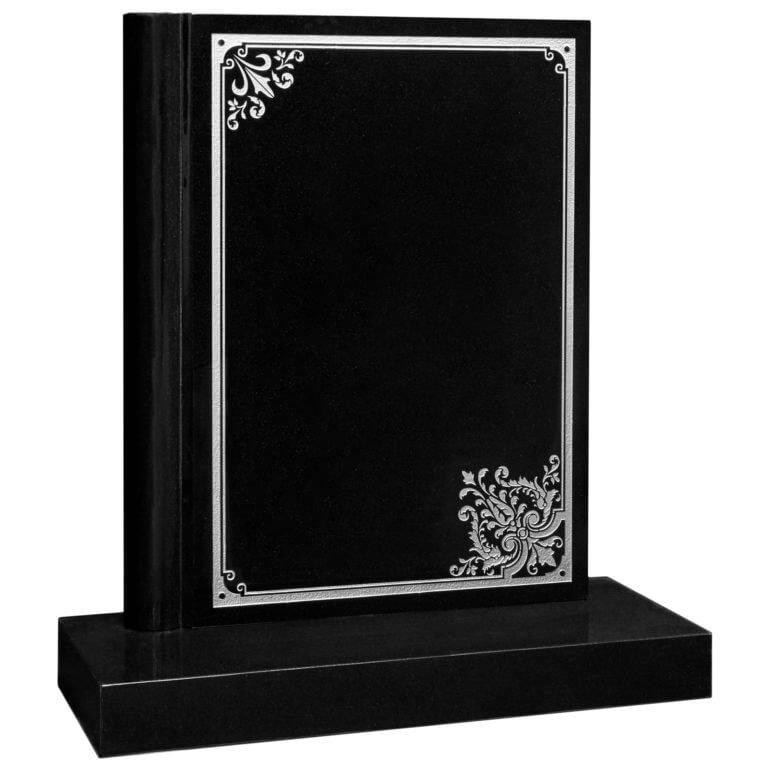 Our book of life headstone with a decorative border and corner embellishments, shown in premium black granite.